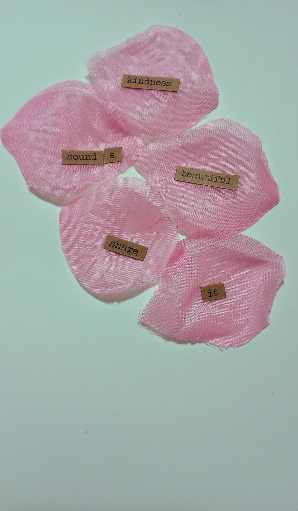 - Day 3: “Kindness” Brown word strips affixed to scattered petals.