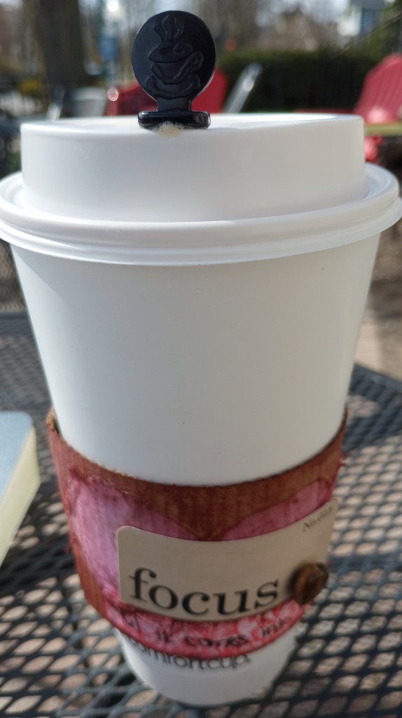- Day 7: “Focus Heart” Coffee sleeve with flashcard word. Tiger Eye Heart. Scribbled sentiment: “…’til it comes into view…”