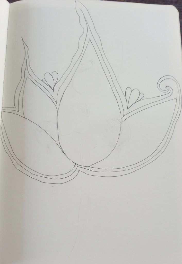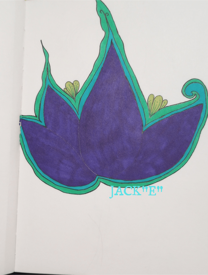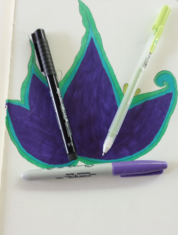 In the picture above my “Lotus” is posing with my favorite mediums. I used Sharpie markers to color my piece. I colored the inner leaves purple and the two outlines (auroras) blue and green.