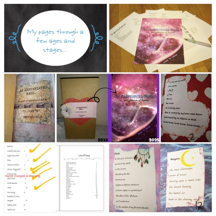 For the last seven years the title An Abbreviated Mass buzzed about my cranial hive. It found itself scribbled onto a page of my Poetic Scraps (idea notebook). I played with its conception and decided my first foray into “self-publishing” would be bits of poetry and collage (scraps of paper here, a sponge of ink there, a few stickers too. The end result was a poetique junk journal/album with seventeen poems. I compiled two variations of the poetry collections just in time for the Christmas Bizarre at work. I had readers but no one wanted to take it home. However,there were people who gave me kudos. I guess it wasn’t a total loss.