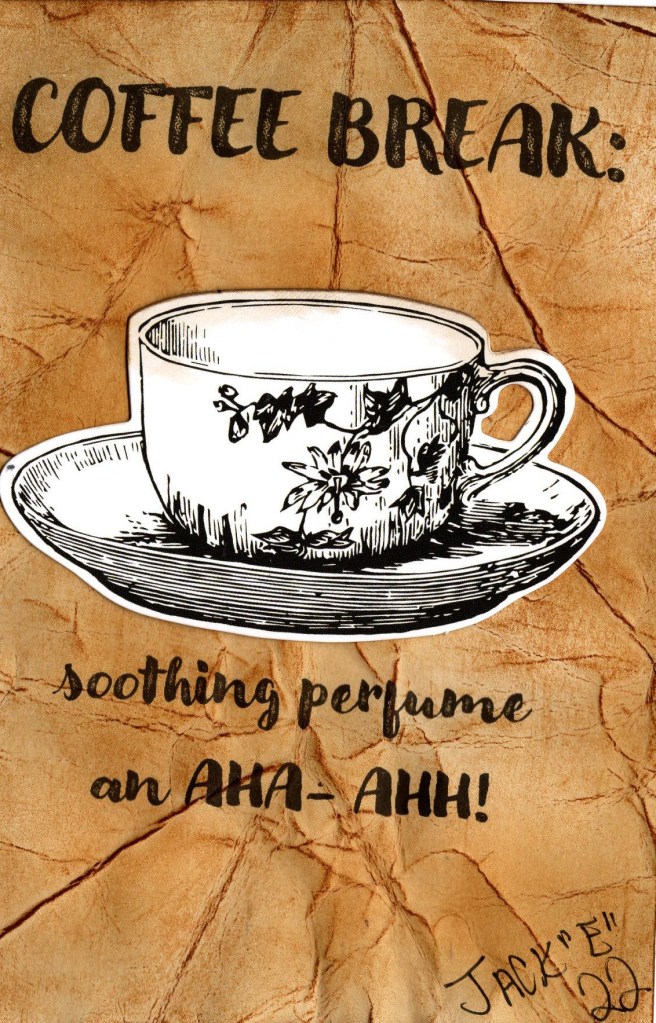 This was a one-liner poem I wrote and decided to set it to a smudge of color. I added the cup and saucer. I like how the background looks like old paper that has endured a coffee “spill”. This piece is available in my shop.