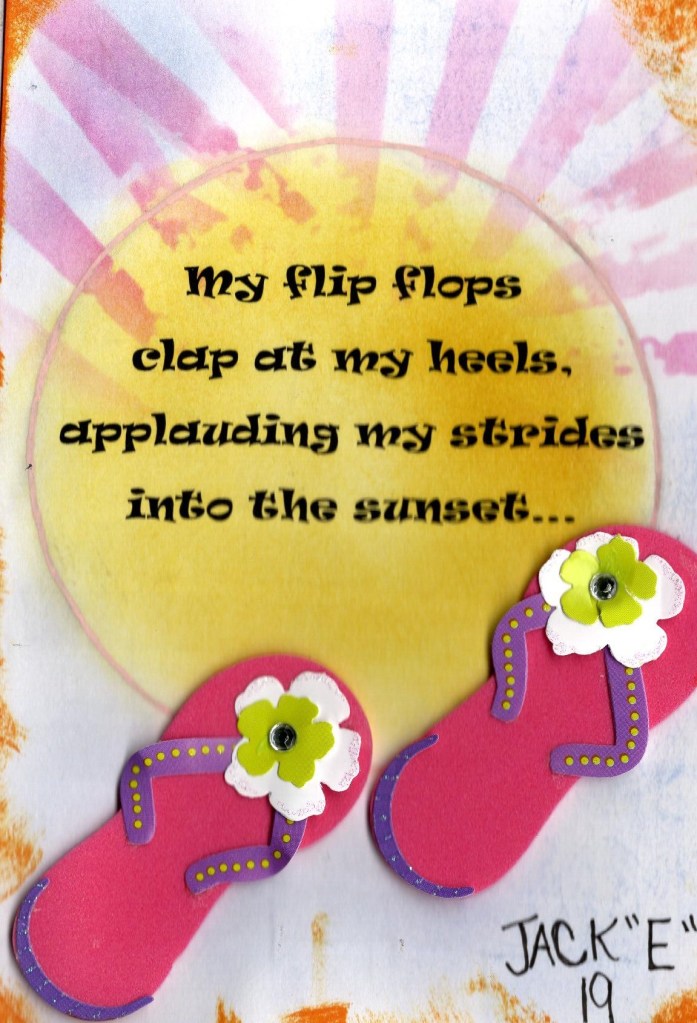 I wrote this poem and then set it to ink. This is probably the only seasonal piece I have currently made. The flip-flops were foam stickers. This is a print. I used distress inks and texture paint with a burst stencil.