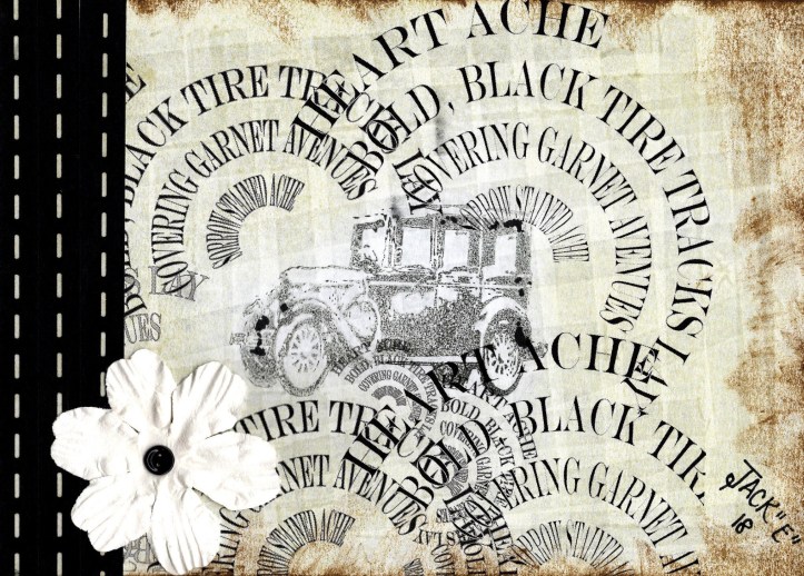 I initially wrote this poem with pen and paper. Then I decided to type it using over arching typography. I smudged/brushed distress inks (old paper and vintage photograph) over the text. I stamped an old car in the center of the tire tracks. Finally, I added a few strips of road washi tape and attached a paper flower. Voila!